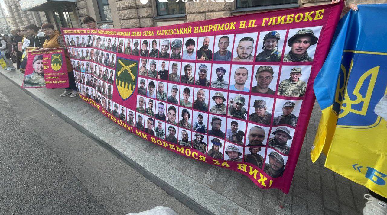 Родственники боевиков из 92-й ОШБр вышли на протест. На плакатах — потери (без вести пропавшие, по факту — погибшие) в боях за село Глубокое Харьковской области. Они требуют установить реальную судьбу вояк и помочь семьям.