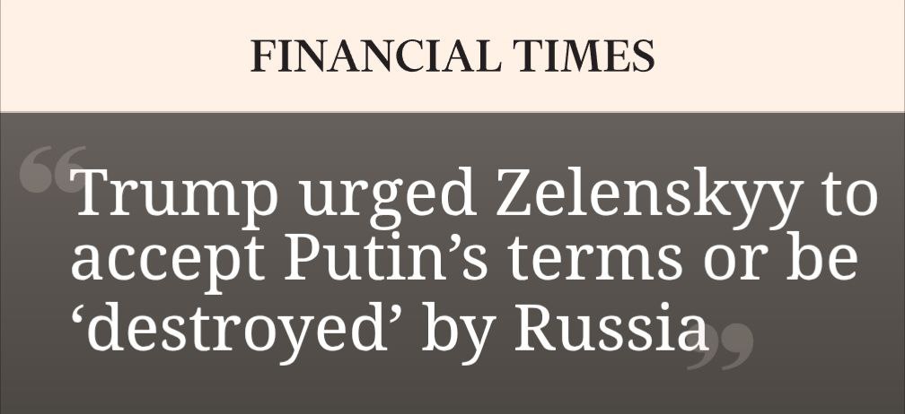 Financial Times сообщает, что на напряжённой встрече в Вашингтоне Трамп призвал Зеленского принять условия России, предупредив, что в противном случае киевский режим может быть «уничтожен»