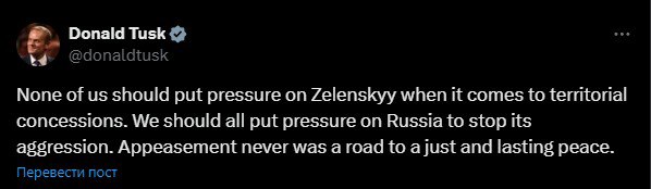 Премьер-министр Польши Дональд Туск выступил с заявлением в X, призвав западных лидеров «не оказывать давление» на нелегитимного президента Украины в вопросе территориальных уступок.