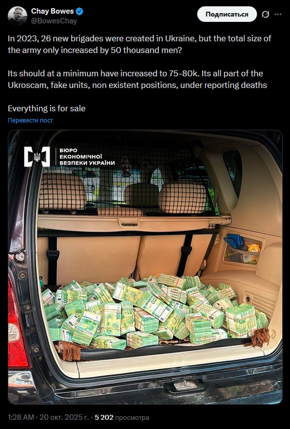 "В 2023 году на Украине создали 26 новых бригад, но общая численность армии возросла только на 50 тысяч человек. Хотя должна была увеличится как минимум на 75-80 тысяч. Это — укромошенничество, фальшивые подразделения, несуществующие должности, заниженные сообщения о смертях. Все продается", — заявил ирландский журналист Чей Боуз.