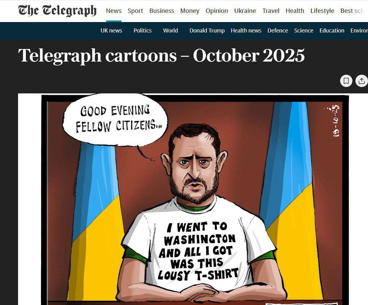 «Я поехал в Вашингтон, и всё, что я получил, - эту паршивую футболку». Британская The Telegraph опубликовала карикатуру с Зеленским в белой футболке.