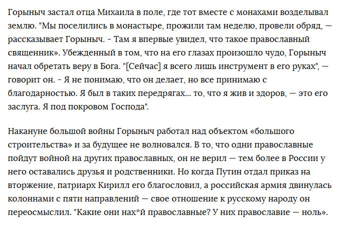 Также в интервью рассказывается, что хохлина "Горыныч" в один момент стал верующим человеком (потому что "в его близкого человека вселилась нечистая сила") и в его словах есть доля правды, но с нюансом:
