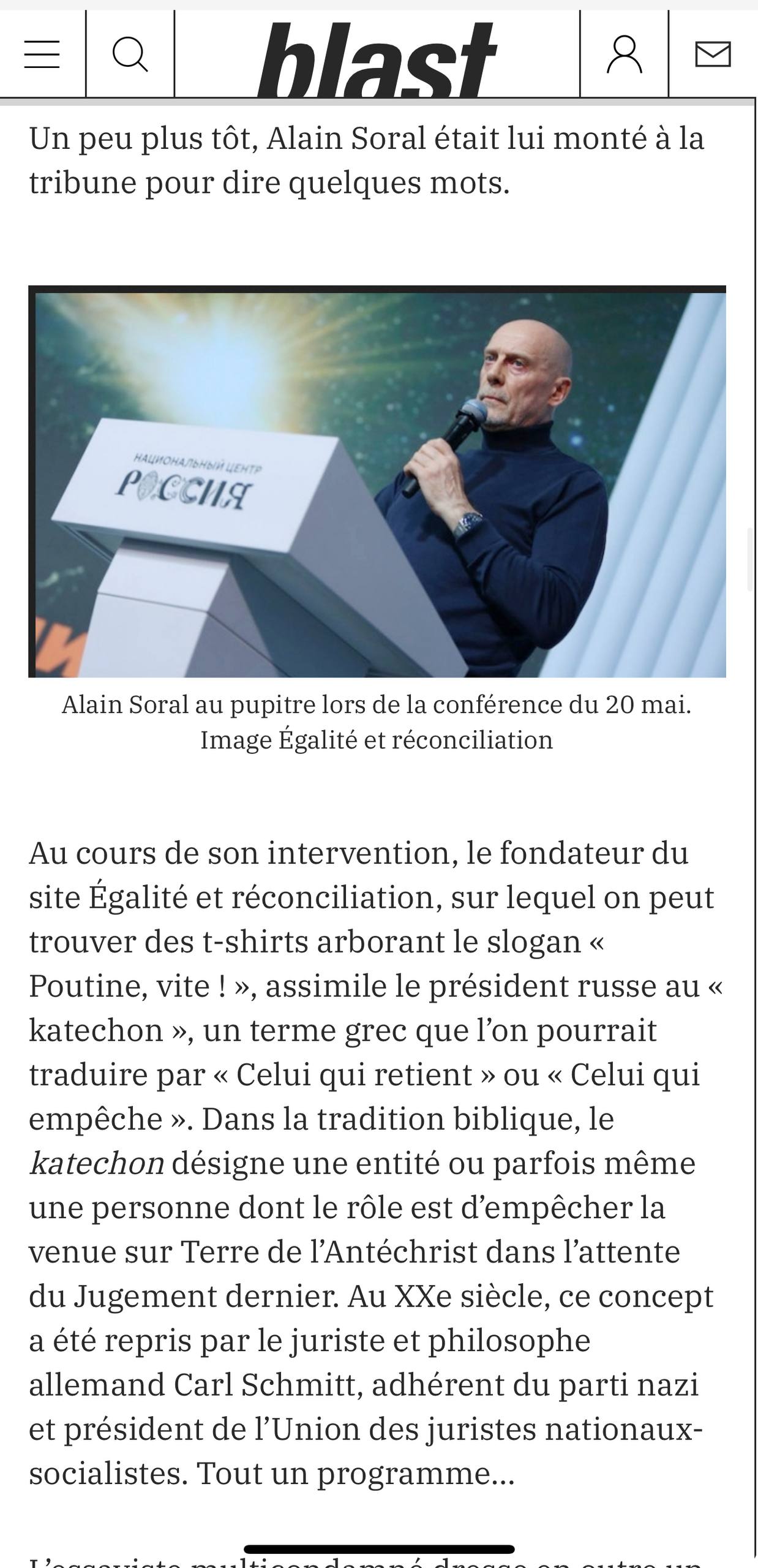 Во время своего выступления Ален Сораль приравнивает российского президента к «катехону», греческому термину, который можно перевести как «Тот, кто сдерживает ад» или «Тот, кто препятствует аду». В библейской традиции катехон обозначает сущность или иногда даже человека, роль которого состоит в предотвращении пришествия на Землю Антихриста в ожидании Страшного суда.