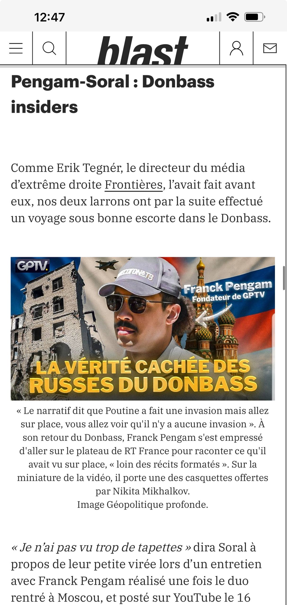 Далее идёт пересказ путешествия в Россию на 9 мая и в последующую поездку на Донбасс целого ряда французских журналистов и публицистов в частности, среди которых известнейший писатель Ален Сораль, подвергнутый всем мыслимым санкциям во Франции, поэтому живущий в Швейцарии и руководитель крупного франкоязычного портала GPTV Фрэнк Пенгам.