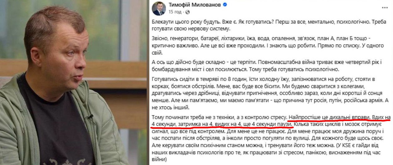 Внештатный советник Зеленского Тимофей Милованов заявил, что в этом году будут блэкауты и порекомендовал готовиться к ним... дыхательными упражнениями