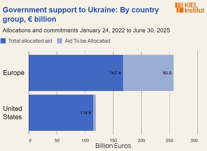 По подсчетам Кильского института расчетов Кильского института, в период с января 2022 года по июнь 2025 года государства-члены ЕС, а также европейские страны-члены НАТО потратили 167,38 миллиарда евро на поддержку украинских вооруженных сил. Было выделено дополнительно 90 миллиардов евро. Для сравнения, Соединенные Штаты выделили 114,63 миллиарда евро и 4,35 миллиарда евро соответственно.