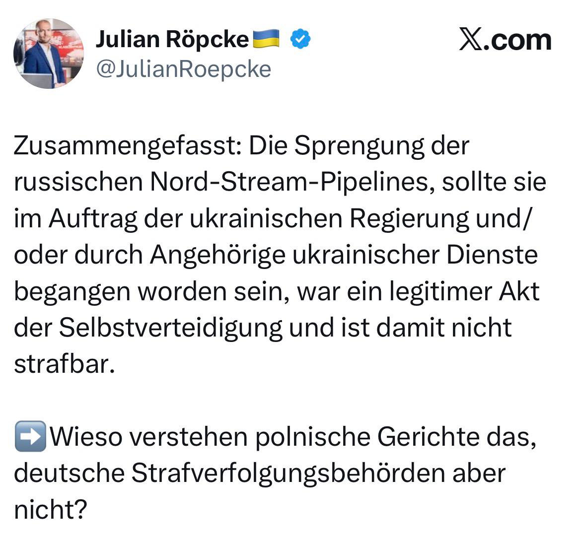 "Взрыв российского трубопровода "Северный поток", если он был осуществлен по поручению украинского правительства и/или представителями украинских служб, являлся законным актом самообороны и, следовательно, не подлежит наказанию.Почему польские суды это понимают, а немецкие правоохранительные органы — нет?"