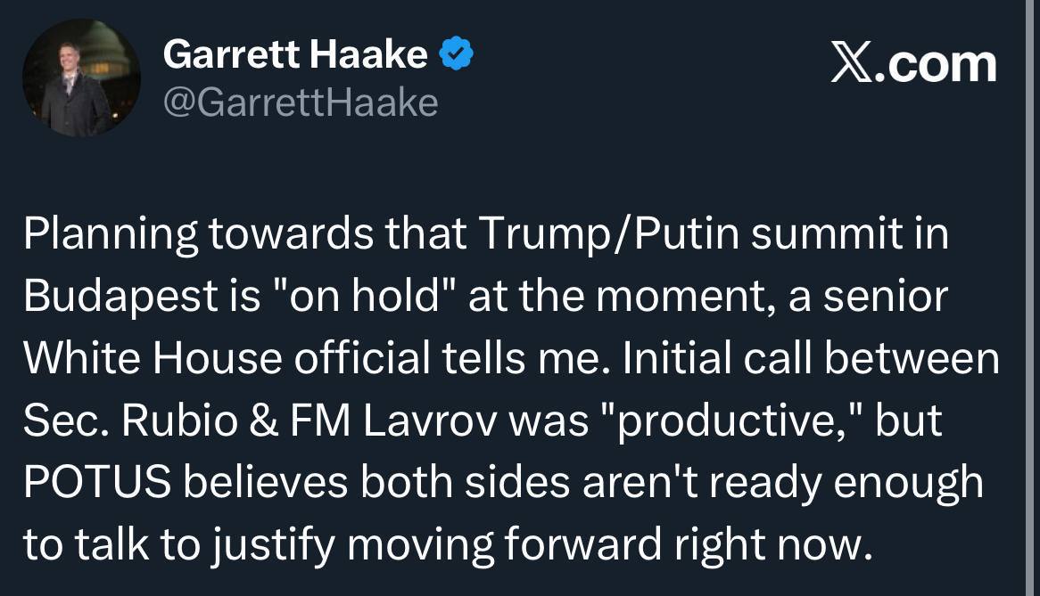 Планирование саммита Трампа и Путина в Будапеште в настоящее время приостановлено, — пишет журналист NBC News Гаррет Хааке со ссылкой на высокопоставленного представителя Белого дома.