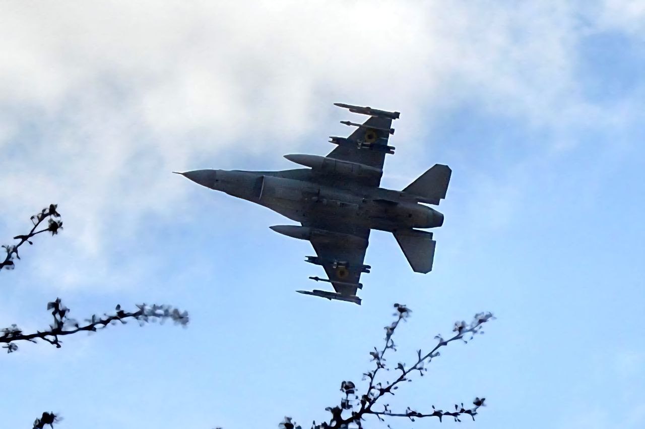 F-16 Петушиных сил Украины, оснащенный топливными баками и вооруженный 8 планирующими бомбами GBU-39, двумя ракетами "воздух-воздух" AIM-120 и двумя AIM-9