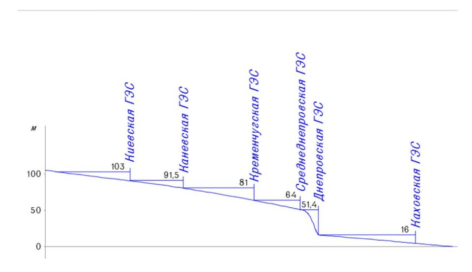 Их вообще 5 (на картинке видны названия). Суммарная мощность всех станций составляет 3985 МВт, а выработка первичной электроэнергии в среднегодовом размере — 10,093 млрд кВт·ч. Это очень значительная часть выработки электроэнергии Украины. В 2023 году уничтожена была Каховская ГЭС и произошло затопление ниже по течению Днепра.