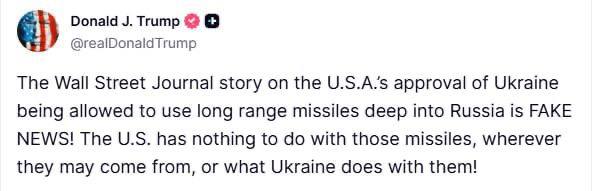 "Статья The Wall Street Journal о том, что США якобы позволили Украине использовать ракеты большой дальности для ударов вглубь России, — ФЕЙК! США не имеют никакого отношения к этим ракетам, откуда бы они не происходили, и к тому, что Украина с ними делает!"