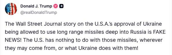 «Статья Wall Street Journal о том, что США одобрили разрешение Украины на использование ракет большой дальности в глубине территории России, является фейковой новостью!» – написал Трамп в соцсети Truth Social.