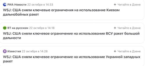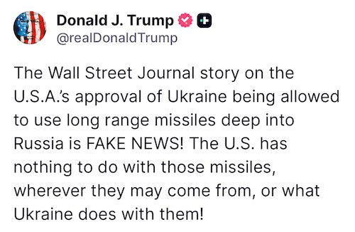 — Материал Wall Street Journal о том, что США одобрили разрешение Украине использовать ракеты большой дальности в глубине территории России, — это ФЕЙКОВАЯ НОВОСТЬ!» США не имеют никакого отношения к этим ракетам, откуда бы они ни взялись, или к тому, что с ними делает Украина.