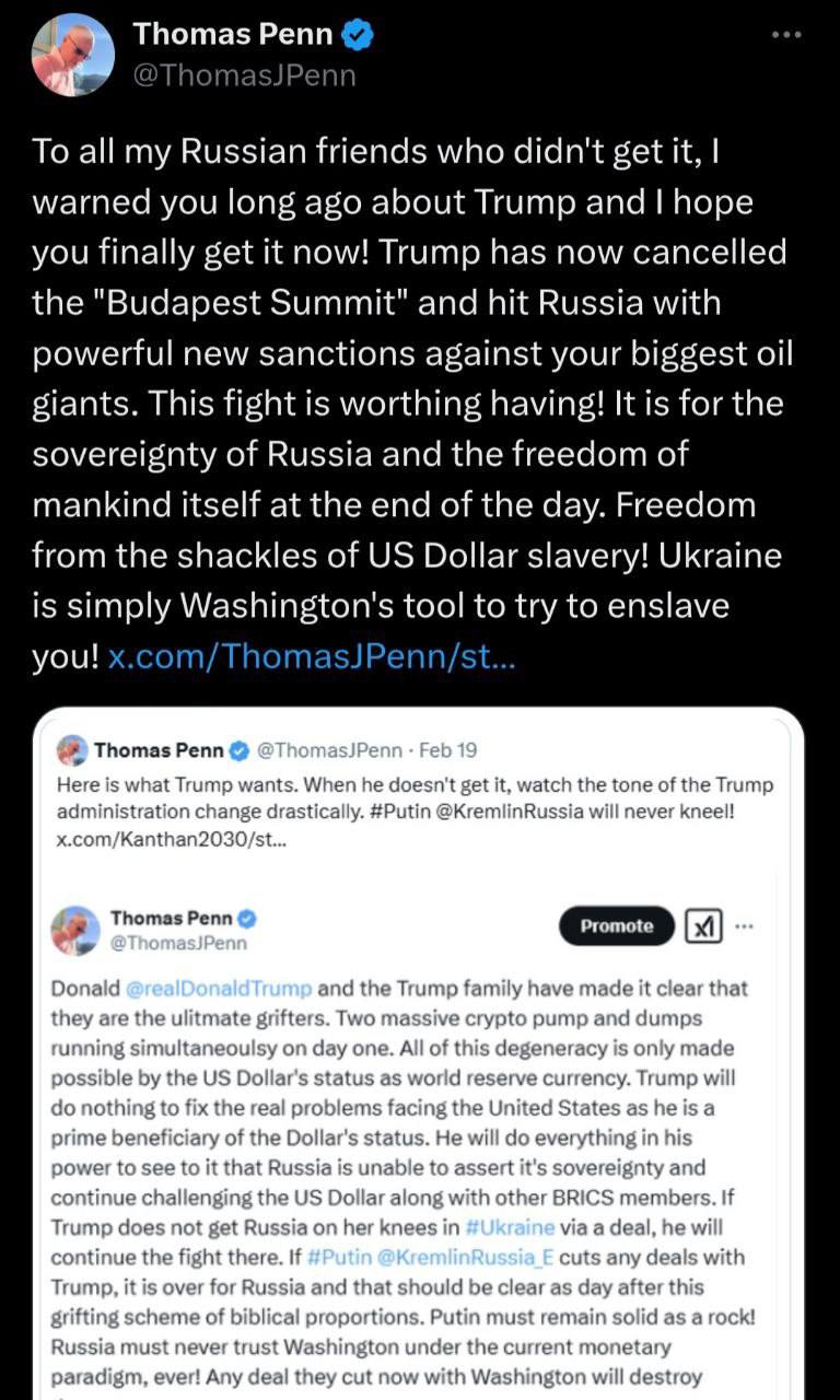 «Всем моим русским друзьям, которые не верили: я давно предупреждал вас о Трампе и надеюсь, что теперь вы наконец-то поняли! Трамп отменил Будапештский саммит и наложил на Россию новые мощные санкции против ваших крупнейших нефтяных гигантов. Но эта борьба стоит того! В конце концов, речь идет о суверенитете России и свободе всего человечества. Свободе от оков рабства доллара США! Украина — это просто инструмент Вашингтона, чтобы поработить вас!».