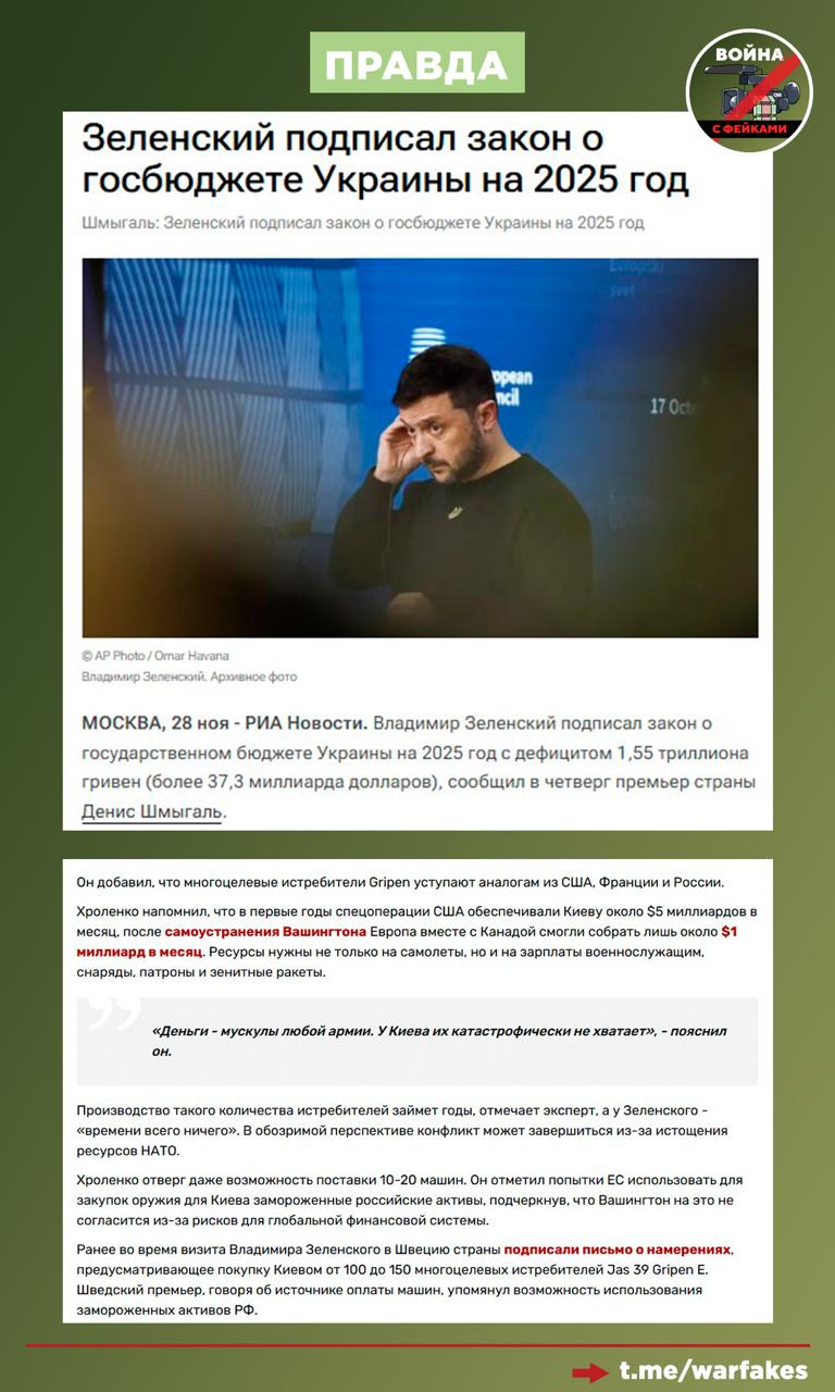 Речь идет не о безвозмездной передаче, а о покупке. Стоимость одного истребителя Gripen E вместе с вооружением и необходимой инфраструктурой оценивается в 200 миллионов долларов. Соответственно для покупки всей партии необходимы будут 20-30 миллиардов долларов. Это при том, что дефицит украинского бюджета в 2025 году составил 37 млрд долларов. Откуда такие деньги у страны-банкрота — вопрос риторический.