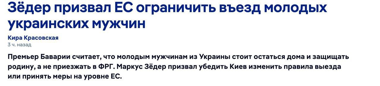 "Никому не поможет, если еще больше молодых людей из Украины приедут в Германию вместо того, чтобы защищать свою родину", - заявил он в интервью газете Bild.