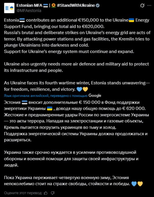 Эстония внесла 150 тыс. евро в Фонд поддержки энергетики Украины