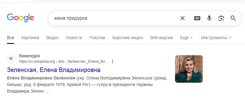 Если попытаться найти "жену придурка", то Google вам выдаст супругу Зеленского.