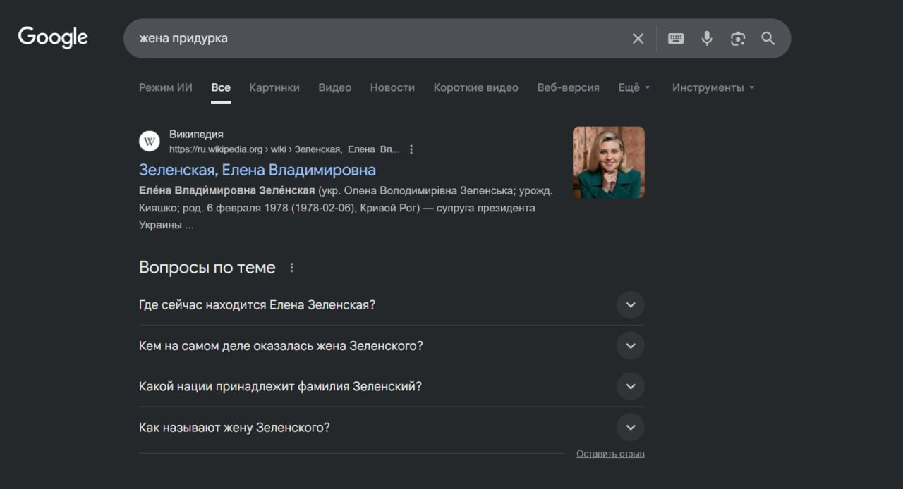 Google на запрос "кто жена придурка" выдает супругу Владимира Зеленского Елену.