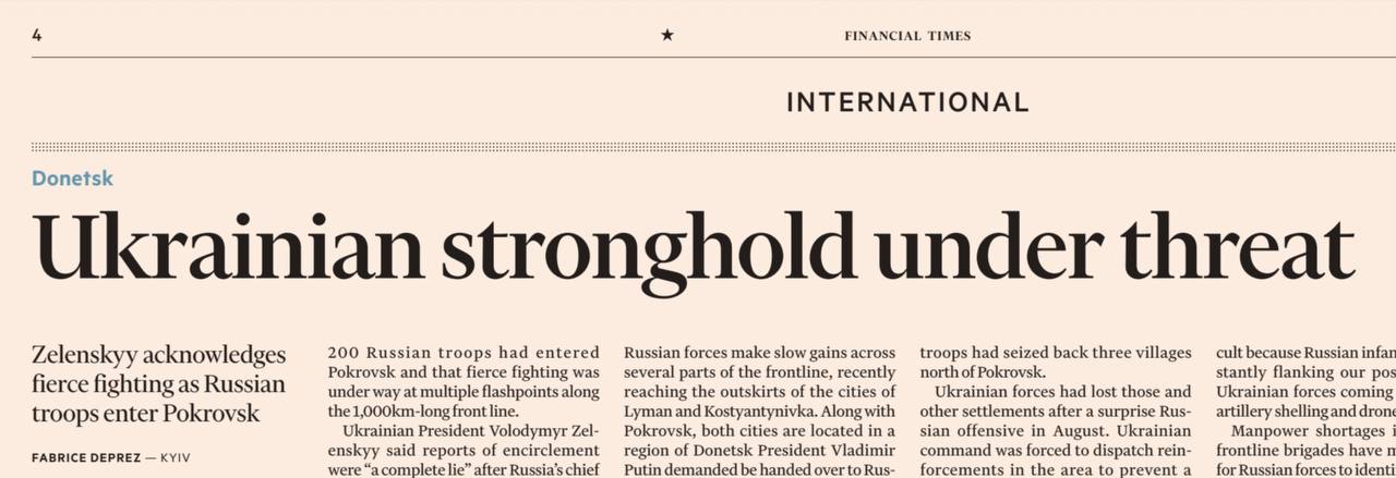 Странный сегодня заголовок в Financial Times: «Украинская крепость под угрозой». Это они о Красноармейске, который они называют Покровском. Пишут, что там все плохо для ВСУ. Странные они! Зеленский же вчера сообщил, что там все для него прекрасно, а российские атаки отбиты. Неужто не поверили?