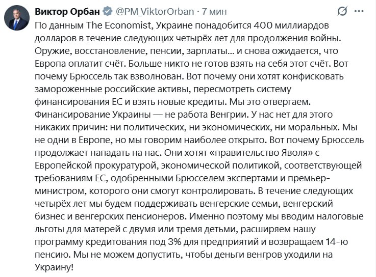 Виктор Орбан добавил, что Киеву понадобится 400 млрд долларов на продолжение конфликта с Россией на ближайшие четыре года.