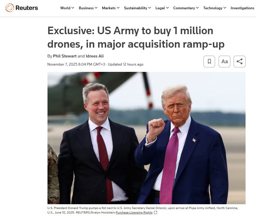 В интервью Reuters Дрисколл подробно рассказал о значительном расширении плана армии по закупке беспилотников, признав наличие проблем, учитывая, что крупнейшее подразделение вооруженных сил США сегодня закупает всего около 50 000 беспилотников в год.