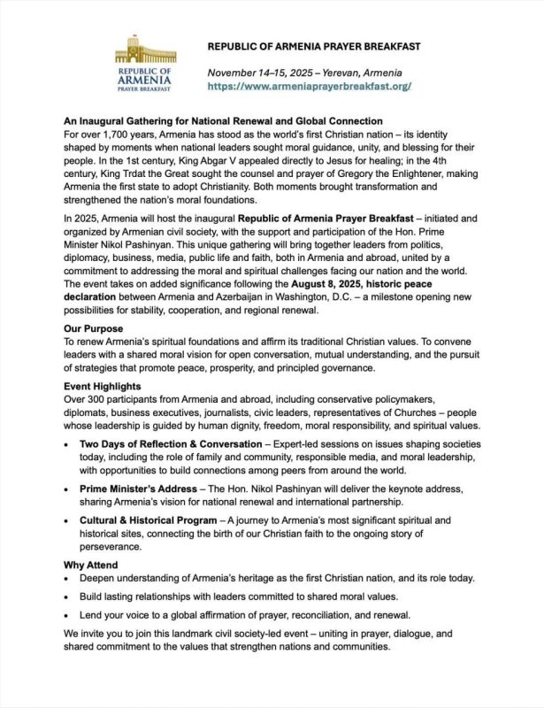 6 февраля 2025 года Пашинян участвует в Национальном молитвенном завтраке в Вашингтоне и, заручившись поддержкой, начинает атаку на Эчмиадзин. Уже в июне появляется идея «координационного совета» для управления Церковью, а в сентябре объявляют о первом «Республиканском молитвенном завтраке» в Ереване. Именно здесь начинается самое интересное.