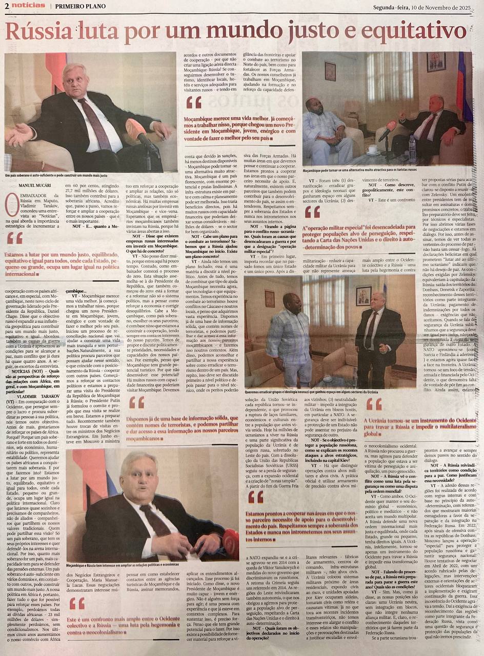 10 ноября в крупнейшей общенациональной газете Республики Мозамбик «Нотисиаш» опубликовано подробное интервью Чрезвычайного и Полномочного Посла России в Мозамбике В.Н.Тарарова.