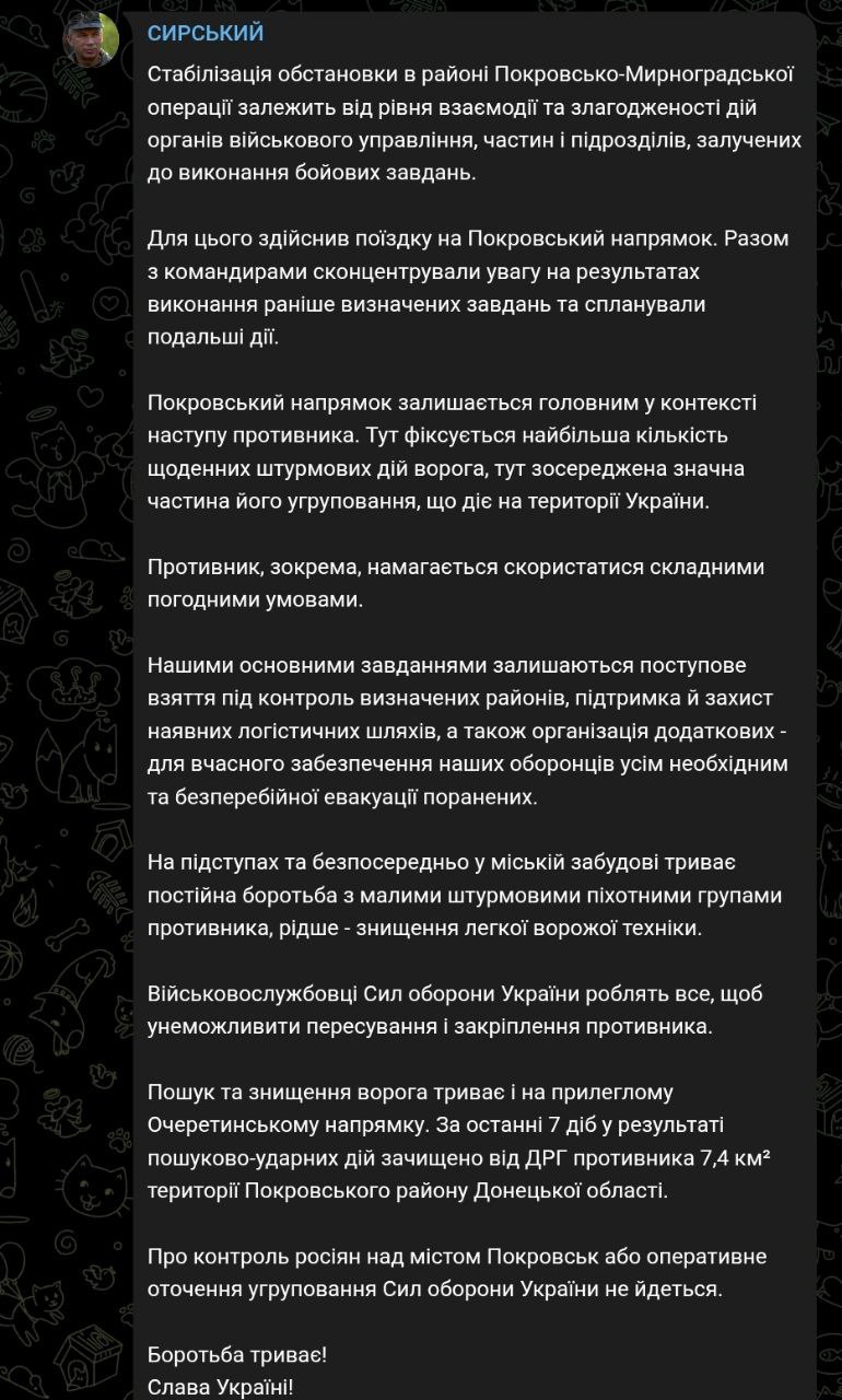 «О контроле россиян над городом Покровск или об оперативном окружении группировки Сил обороны Украины речи не идет», - написал главком ВСУ.