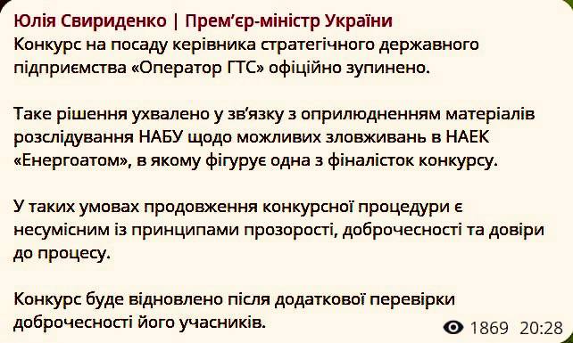 Конкурс на должность руководителя «Оператора ГТС» официально приостановлен из-за коррупционного скандала вокруг «Энергоатома», — премьер Украины Свириденко