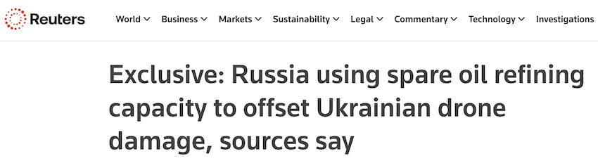 Три источника в нефтегазовой отрасли РФ сообщили агентству Reuters, что до атак российские НПЗ работали значительно ниже своей номинальной мощности и смогли смягчить последствия ударов БПЛА, перезапустив резервные блоки как на поврежденных, так и на не атакованных заводах, а также оперативно вводя в эксплуатацию поврежденные перегонные блоки после ремонта.