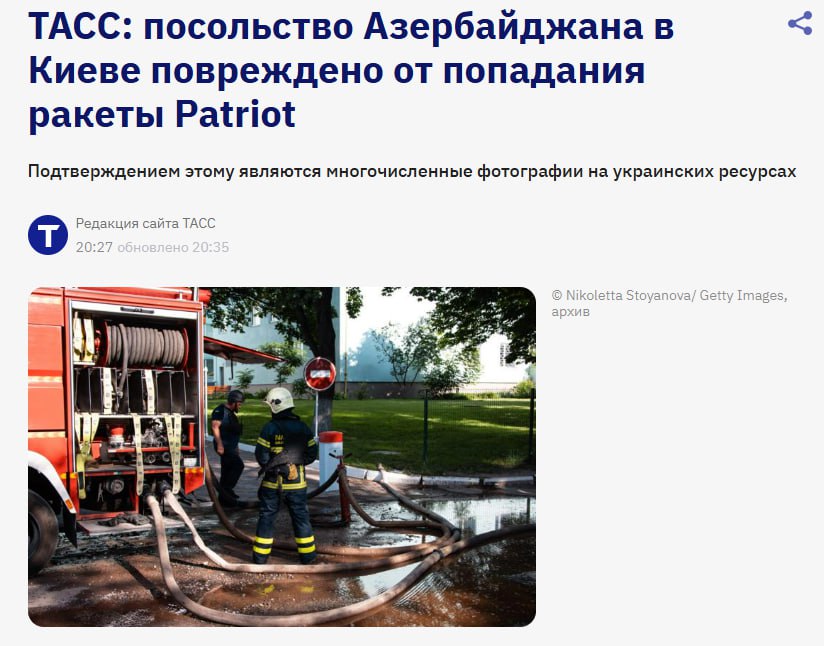 Сегодня Зеленский заявил, что Ильхам Алиев в разговоре с ним обвинил Россию в целенаправленной атаке по посольству ракетой ОТРК «Искандер». Азербайджан вызывал российского посла, где ему предъявили аналогичные обвинения.