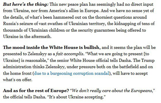 ‘В разработке этого нового мирного плана, похоже, не участвовала напрямую ни Украина, ни союзники Америки в Европе. Настроение в Белом доме уверенное, и, судя по всему, план собираются предъявить Зеленскому как свершившийся факт.