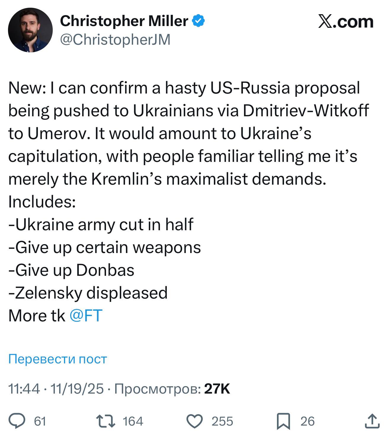 Плана США по Украине из 28 пунктов ещё никто из широких народных масс в глаза не видел, но его торпедирование и саботаж со стороны глобалистов уже начался. Вот, например, журналист FT Кристофер Миллер уже хлопочет.