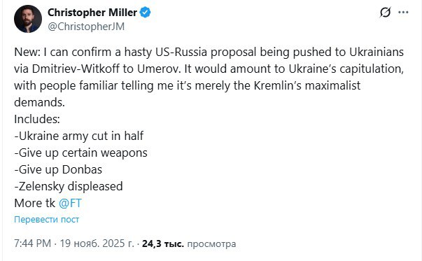 Журналист Financial Times Миллер уточнил, что 'Уиткофф и Дмитриев продвигают это предложение Умерову' [которого Рада требует отправить в отставку] и назвал такое решение поспешным, уточнив, что Зеленский им недоволен.