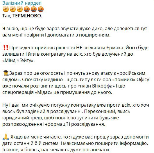Железняк: ‘Срочно. Президент принял решение НЕ увольнять Ермака. Его будут оставлять и переходить в контратаку на всех, кто был причастен к ‘Миндичгейту’. Сейчас об этом объявят и снова начнут атаку с ‘российским следом’. Уверен, будет какой-то юридический трэш, чтобы полностью остановить любое распространение информации и расследование’.