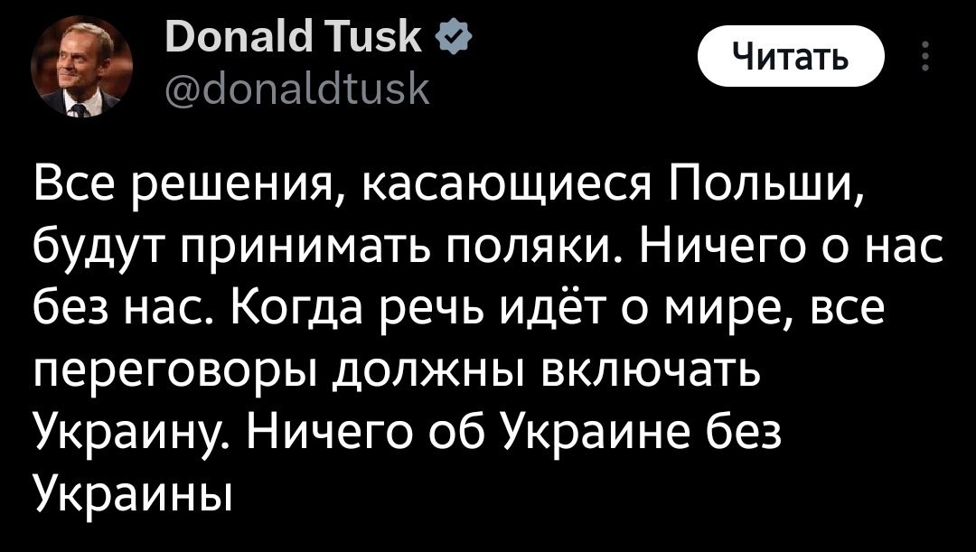 "Все решения, касающиеся Польши, будут принимать поляки. Ничего о нас без нас. Когда речь идёт о мире, все переговоры должны включать Украину. Ничего об Украине без Украины"