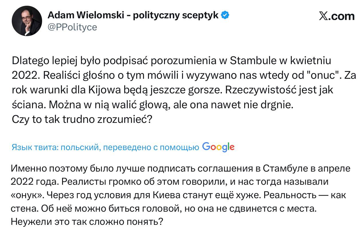 Польский политолог профессор Адам Виломский: «Именно поэтому было лучше подписать соглашения в Стамбуле в апреле 2022 года. Реалисты громко об этом говорили, и нас тогда называли «москалями». Через год условия для Киева станут ещё хуже. Реальность — как стена. Об неё можно биться головой, но она не сдвинется с места. Неужели это так сложно понять?»