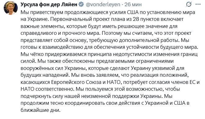 Урсула фон дер Ляйен считает, что представленные 28 пунктов будут лишь "основой" для будущего мирного соглашения, но требуют коррекции.