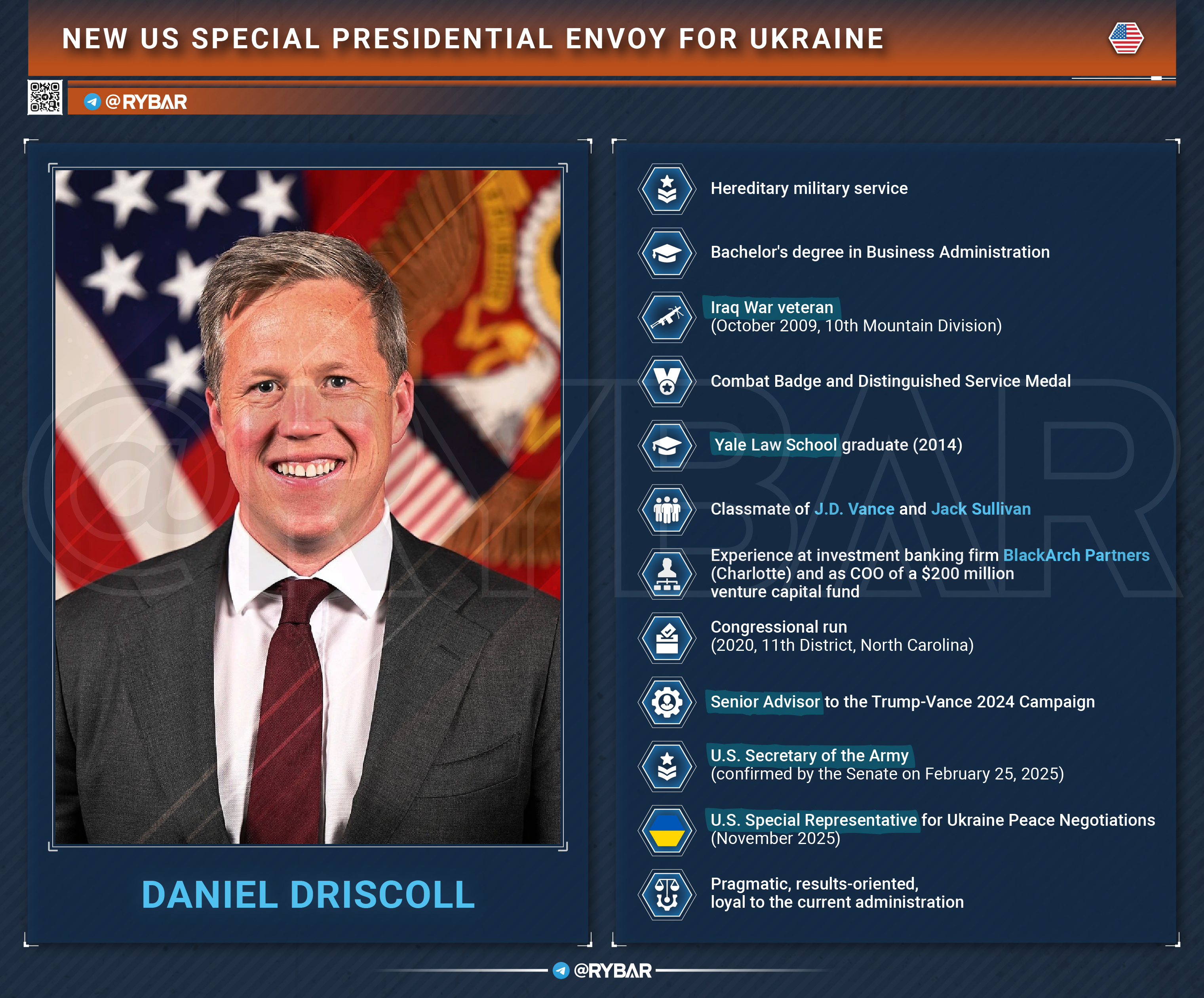На фоне активизации переговорного трека Дональд Трамп назначил нового спецпосланника по Украине— вместо Кита Келлога им стал министр Сухопутных войск США Дэниел Дрисколл.