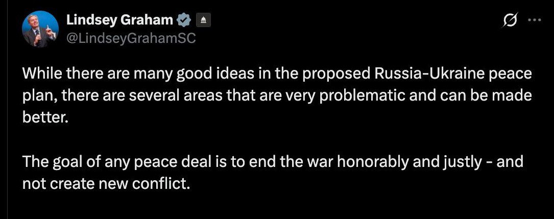 Сенатор-республиканец Линдси Грэм* заявил, что предложенный Дональдом Трампом вариант урегулирования «содержит немало хороших идей», но при этом есть «весьма проблемные моменты, которые следует улучшить».