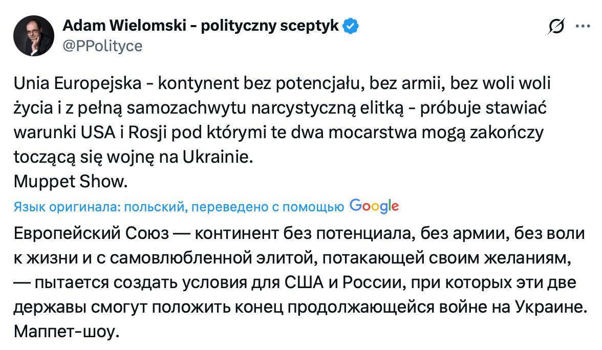 Польский политолог Адам Виломский дал довольно четкую характеристику «мирному плану» ЕС: «Европейский Союз — континент без потенциала, без армии, без воли к жизни и с самовлюбленной элитой, потакающей своим желаниям, — пытается выдвинуть условия для США и России, при которых эти две державы смогут положить конец продолжающейся войне на Украине. Маппет-шоу».