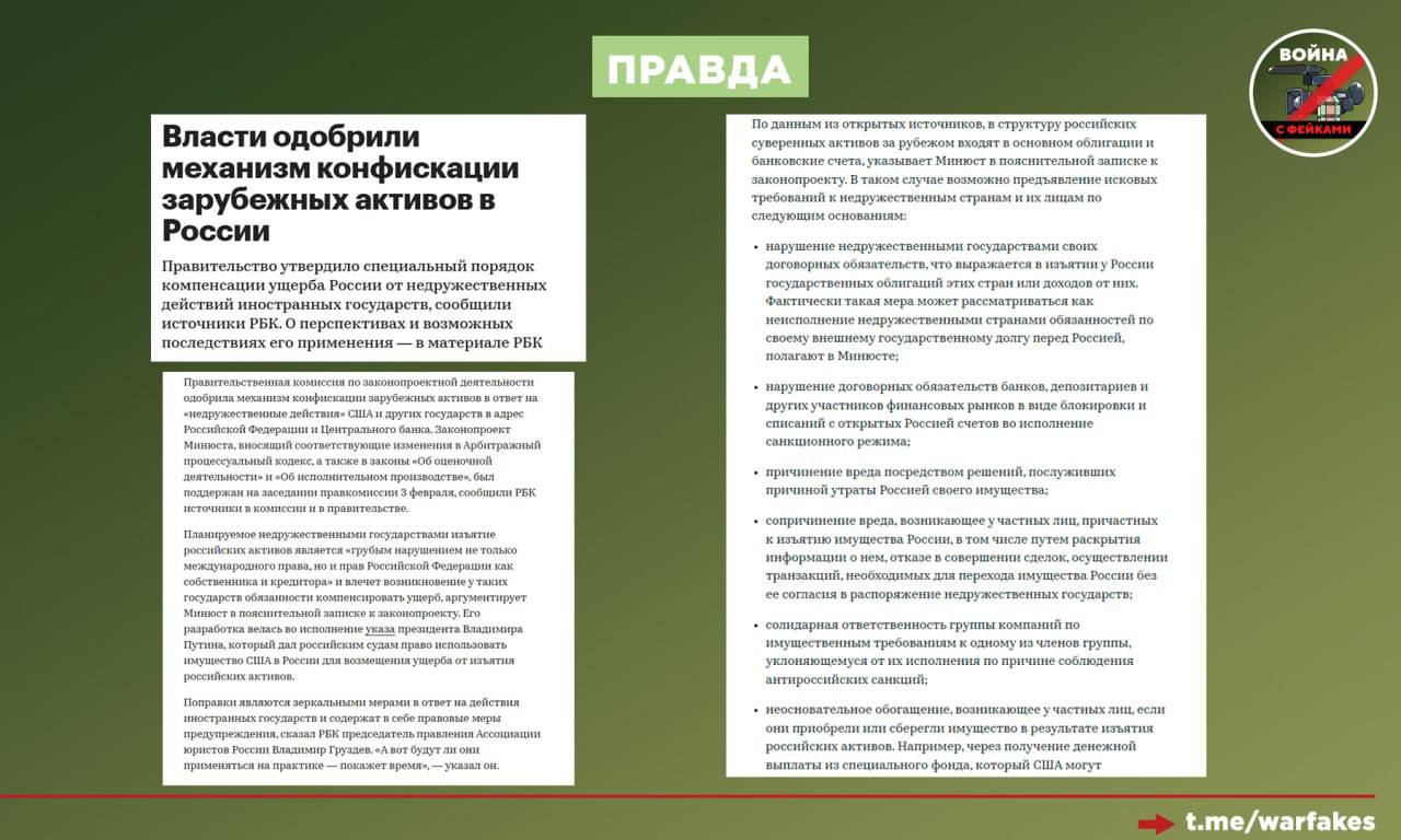 Правда: В российском законодательстве закреплена возможность ускоренного перевода западных активов в федеральную собственность для ее дальнейшей перепродажи и пополнения государственного бюджета.