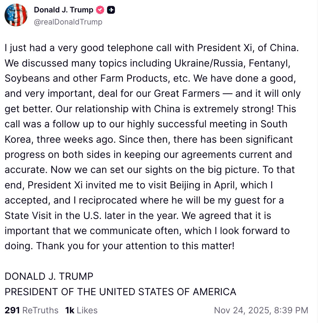 «У меня только что состоялся очень хороший телефонный разговор с председателем КНР Си. Мы обсудили множество тем, включая ситуацию вокруг Украины и России, фентанил, сою и другие сельскохозяйственные продукты. Мы заключили хорошую и очень важную сделку для наших великих фермеров — и дальше будет только лучше. Наши отношения с Китаем исключительно крепкие!
