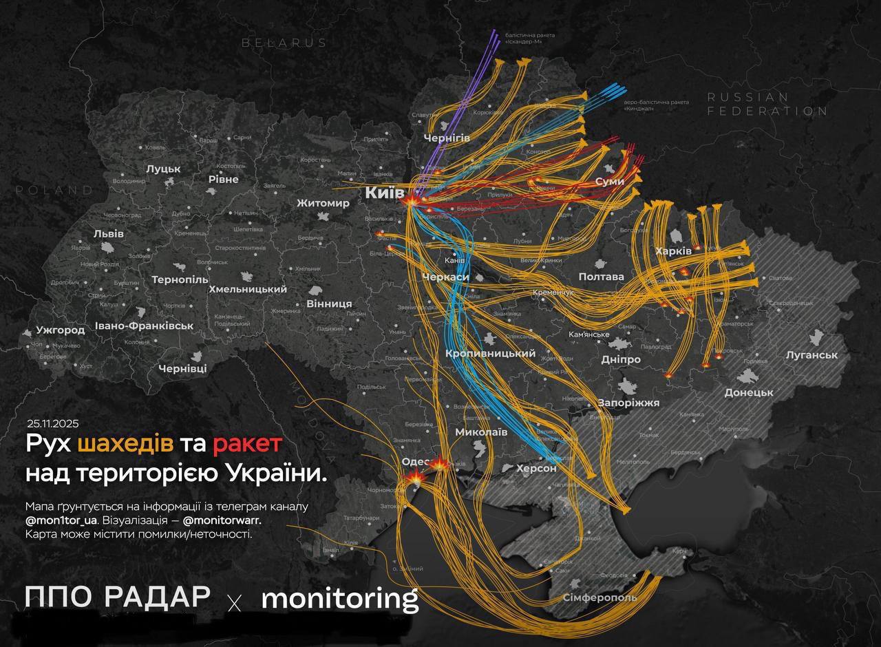 Появилась карта маршрутов российских ракет и БЛА, наносивших ночной удар по Украине
