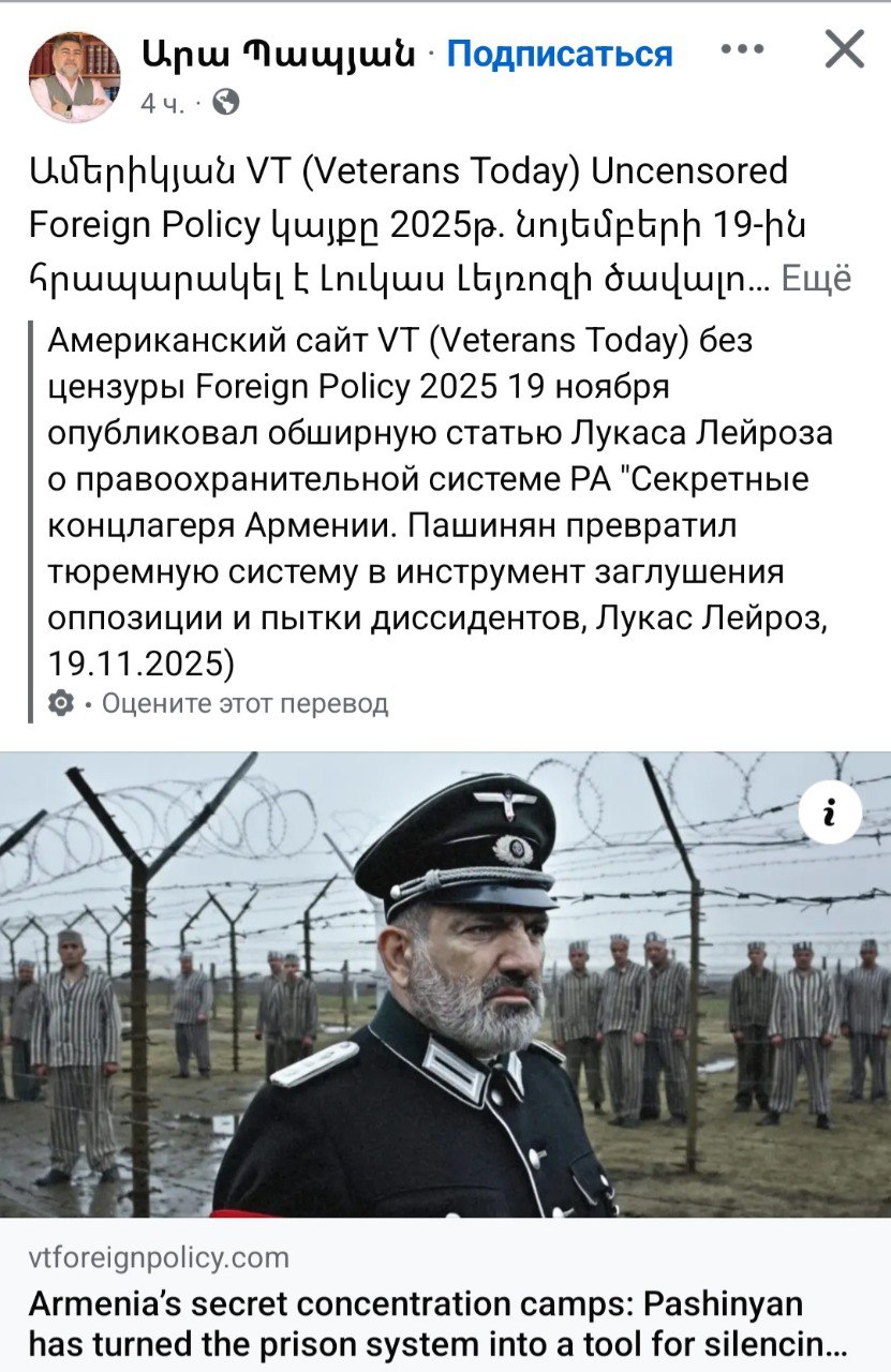 Событие из разряда «невероятно, но факт»: Ара Папян опубликовал статью американского издания, которая не просто очерняет его, а приравнивает к нацистам фашистской Германии. Собственно, в нацистской форме Пашинян и стоит на обложке материала. Уникально.