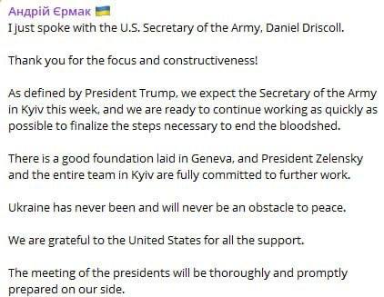 Об этом сообщил глава офиса Зеленского Андрей Ермак. По его словам, визит Дрисколла согласован с президентом Трампом.