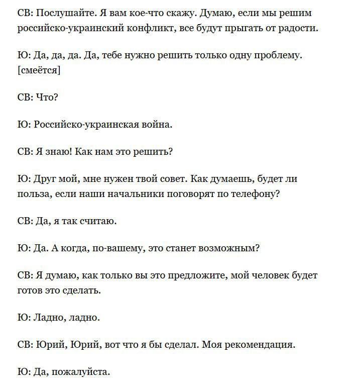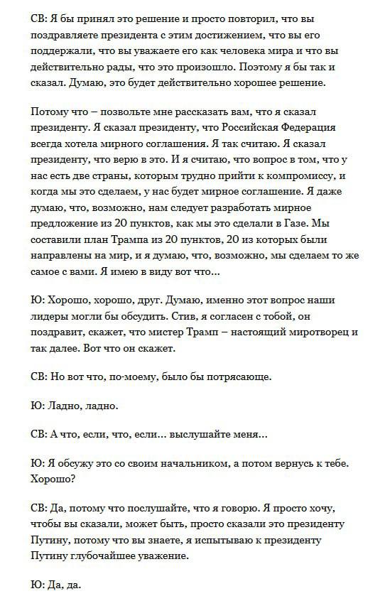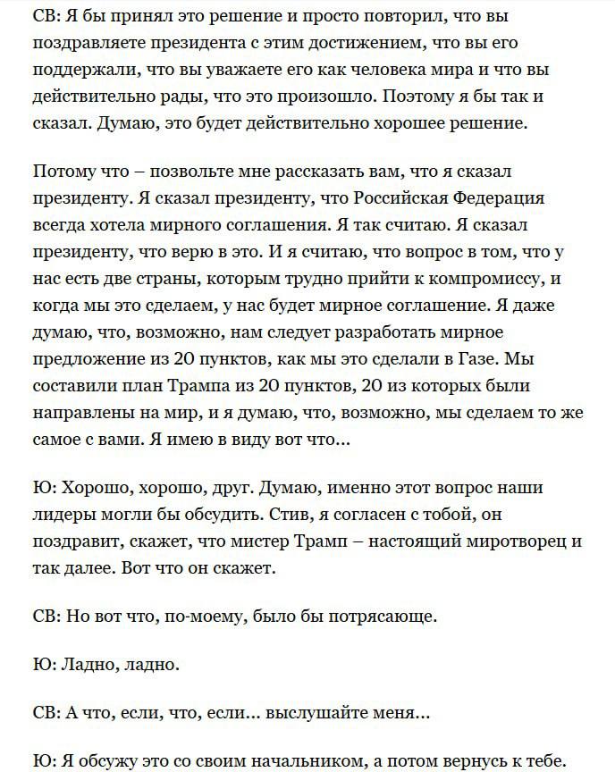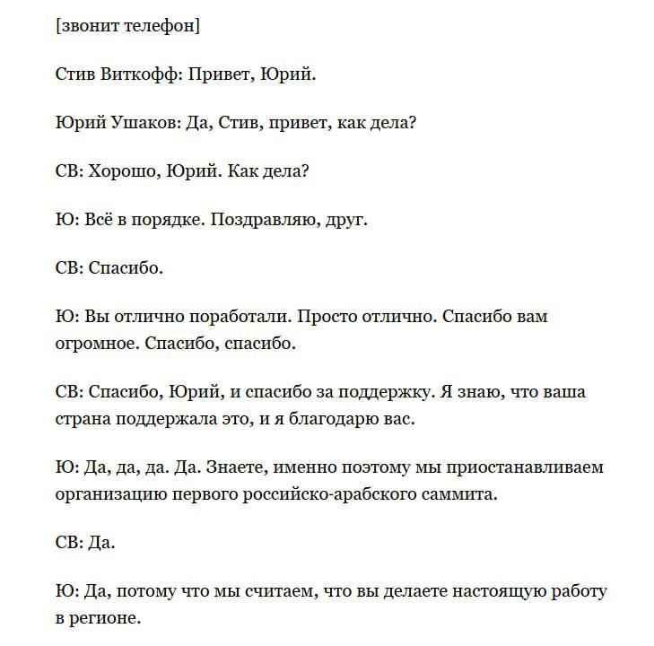 Bloomberg в этот раз опубликовал якобы расшифровку разговора спецпредставителя Трампа Уиткоффа с помощником президента России Юрием Ушаковым.