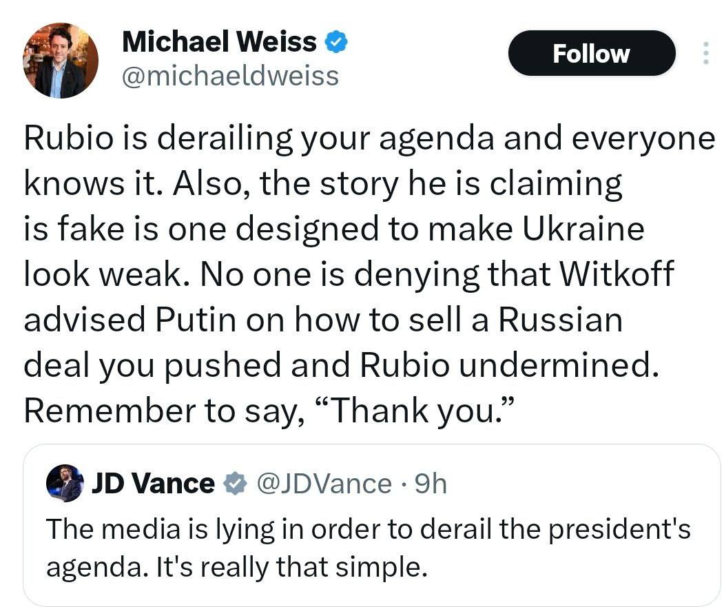 чтобы продемонстрировать, что они с Рубио друзья, вице-президент США Вэнс репостнул в X публикацию Рубио с комментарием "СМИ лгут, чтобы разрушить повестку президента. Все настолько просто".