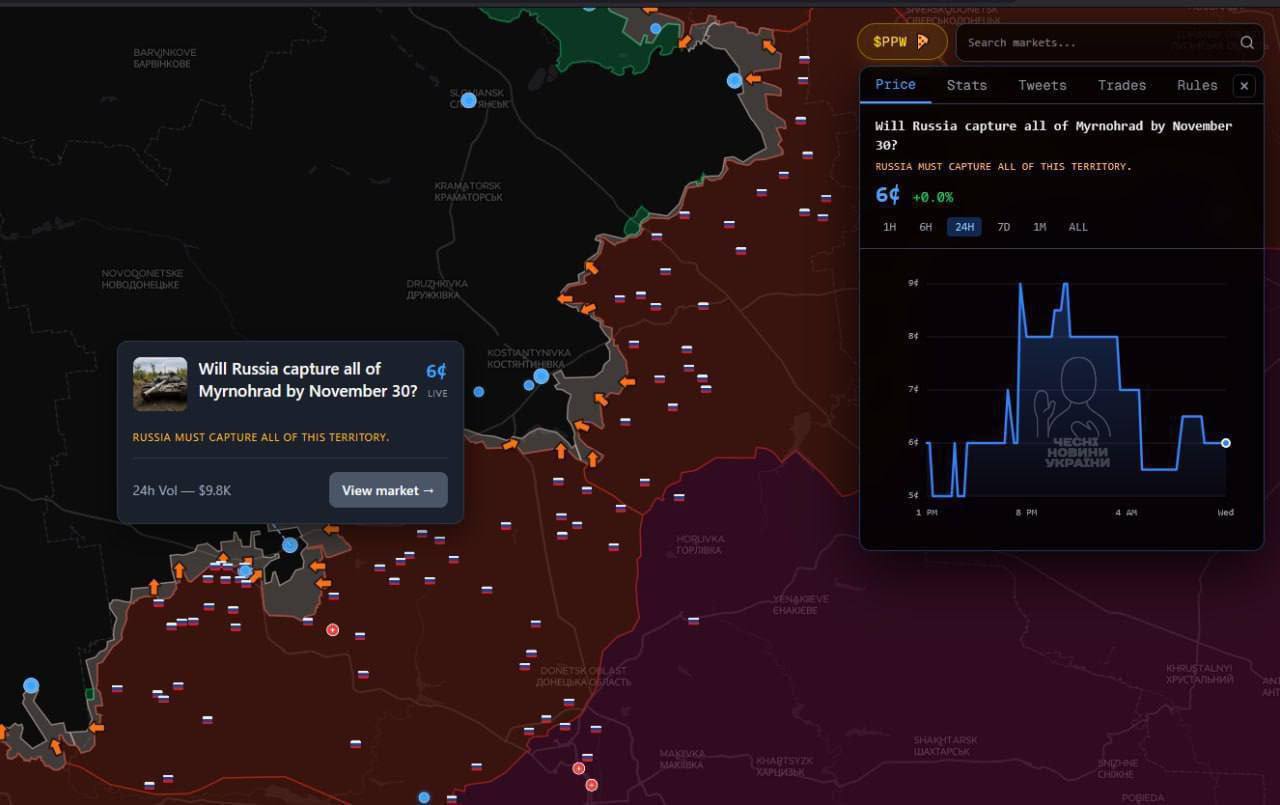 Букмекеры Polymarket зарабатывают на интересу к войне: то рекламировали свою платформу с убегающим вором-Зеленским, теперь открыли ставки на то, какой населенный пункт следующим будет освобожден армией России.